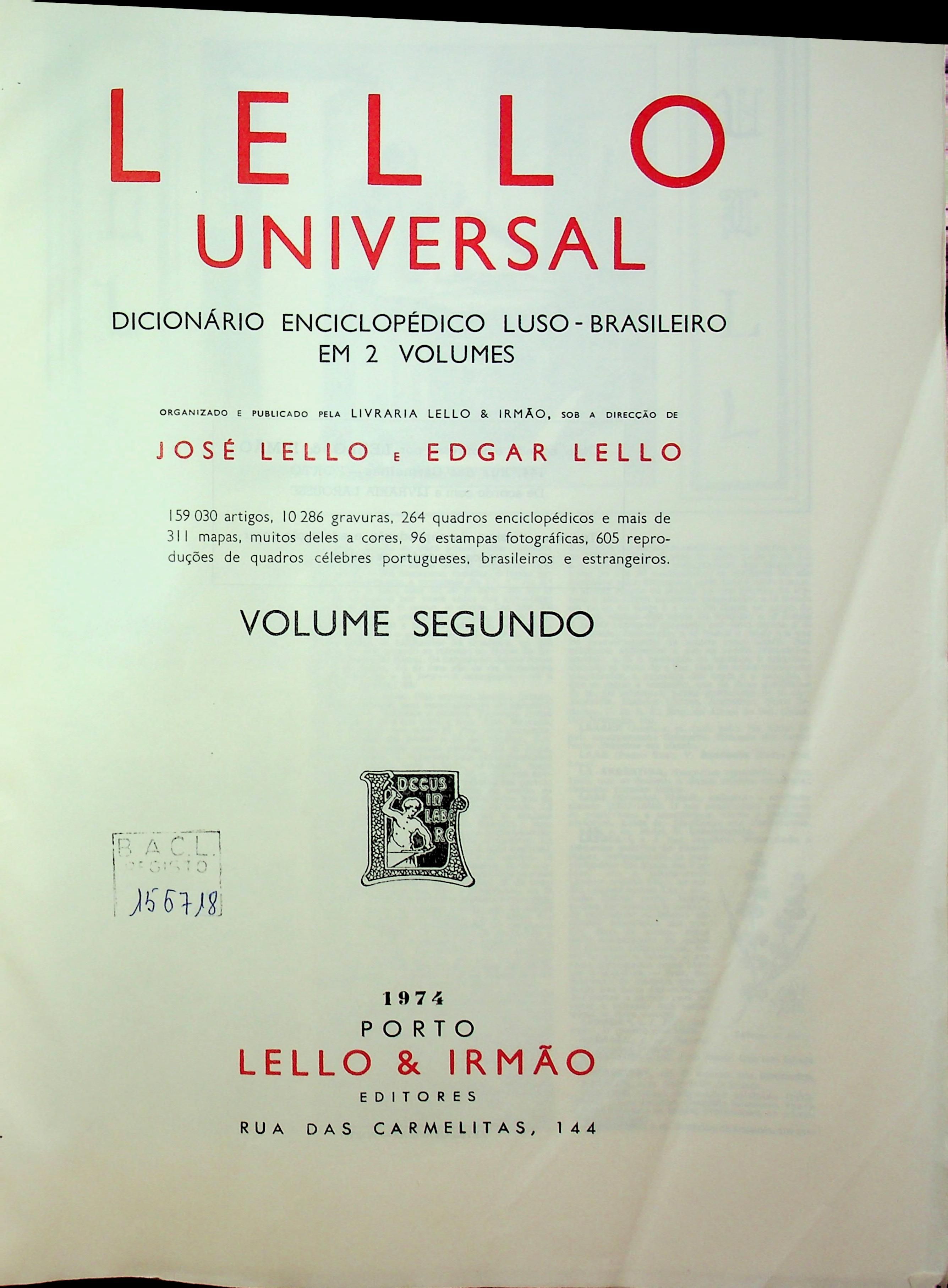 dir. Edgar Lello. (Lello universal ; 1). Inclui 159 030 artigos, 10 286 gravuras, 244 quadros enciclopédicos e mais de 311 mapas, muitos deles a cores, 96 estampas fotográficas, 605 reproduções de quadros célebres portugueses, brasileiros e estrangeiros.