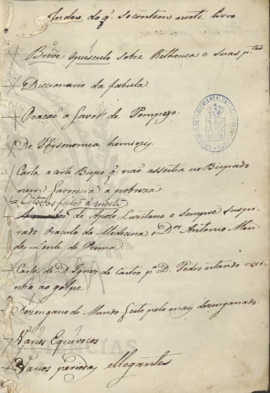 Contém 10 textos. Enc. inteira em pergaminho. 1 Opusculo breve sobre Rethorica e suas partes. Pág. 1. 2 Diccionario da fábula. Pág. 21. 3 Oração a favor de Pompeyo. Pág. 72. 4 De physionomia hominis. Pág. 79. 5 Carta a certo Bispo que não assistia no Bispado nem favorecia a pobreza. Pág. 84. 6 Oitavas feitas à morte do Apolo Luzitano e Sempre Suspirado oraculo da Medicina, Doutor Antonio Mendes, lente de Prima. Pág. 90. 7 Dezengano do mundo feito pelo mais desengano. Pág. 99. 8 Varios equivocos. Pág. 113. 9 Varios periodos elegantes. Pág. 127. 10 Conceitos judiciosos. Pág. 143. Texto integral (PDF, 15,3 MB).