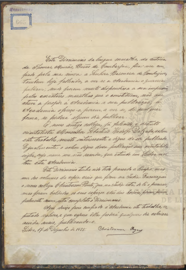 Original. Este dicionário foi elaborado na Índia e passado a limpo do original mas um dos volumes da cópia perdeu-se. O presente tomo compreende as letras A a C. Enc. com lombada e cantos de pele. Pastas de papel manchado. De acordo com a nota de Cristóvão Aires colada no verso da pasta superior, este dicionário foi-lhe confiado pela viúva do autor para que a Academia das Ciências de Lisboa o publicasse, tendo a obra dado entrada na instituição em 1925