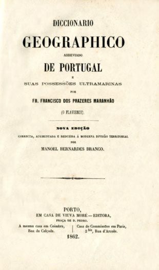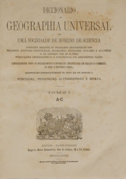 Diccionario de Geographia Universal por uma Sociedade de Homens de Sciencia: composto segundo os Trabalhos Geographicos dos Melhores Auctores Portuguezes, Brazileiros, Francezes, Inglezes e Allemães e de accordo com as Ultimas Publicações Chorographicas... Desenvolvido consideravelmente na parte que diz respeito a Portugal, Provincias Ultramarinas e Brazil